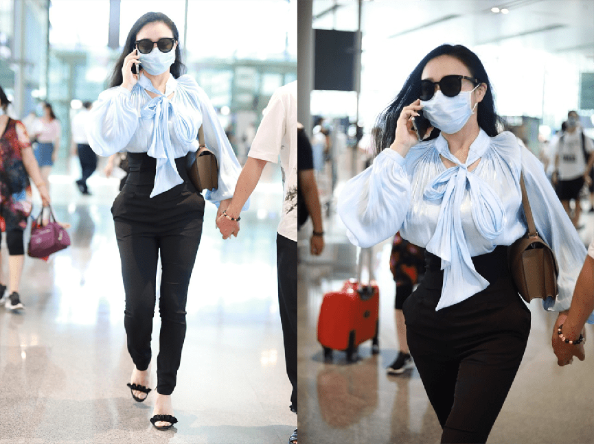 宽松的蓝色衬衫,版型上是没有束缚的,所以微胖星人也可以穿,加上飘带的装饰,随意地打个蝴蝶结,都是很好看的,搭配黑色修身裤,简洁又大方。