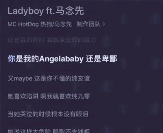 近日,有网友发现热狗MCHotdog中的歌词提到了Angelababy,歌词中写道“你是我的Angelababy,还是卑鄙”,引发争议,有网友认为这对Angelababy非常不尊重。