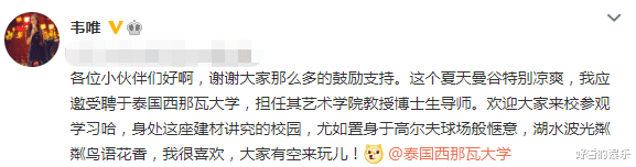韦唯亲自发文宣布,在大家的鼓励和支持之下,她有幸担任了泰国名校的博士生导师,从特别有名气的女歌手摇身一变成为了教授级别的人物,这可是质的飞跃。