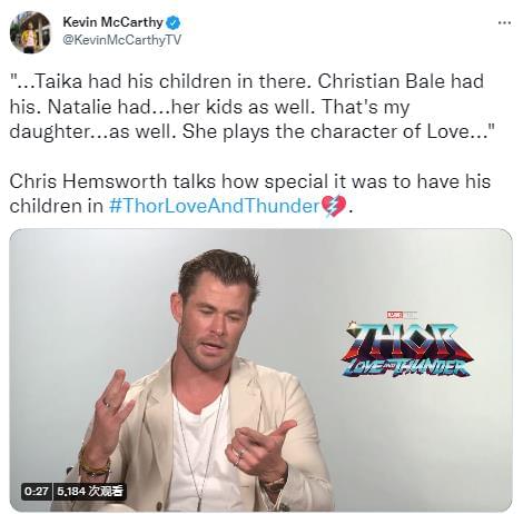 在最近接受凯文·麦卡锡电视台采访时,克里斯·海姆斯沃斯被问及到了为何他的孩子出现在预告片中时,这位男演员透露,很多演员的孩子都出现在了《雷神4》这部电影。因为,他表示他的孩子们也非常渴望出演电影。不仅如此,锤哥还表示,除了让儿子扮演年轻的雷神之外,他的女儿还扮演了一个名为“爱”的角色。他承认,这是一次有趣的家庭体验。