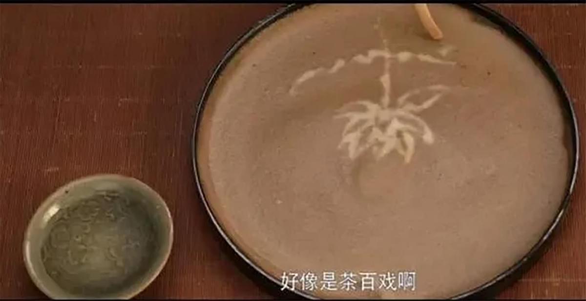 什么意思呢?就是在点茶拂出的茶沫上,用专门的器具蘸水来作画,创作水丹青。不但需要画功,还考验点茶的基本功,因为只有打出更为持久的泡沫才有作画和欣赏的时间。