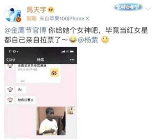 然后马天宇发了微博为杨紫拉票,并晒出了聊天记录,是杨紫叫他投票,后来又秒删了。