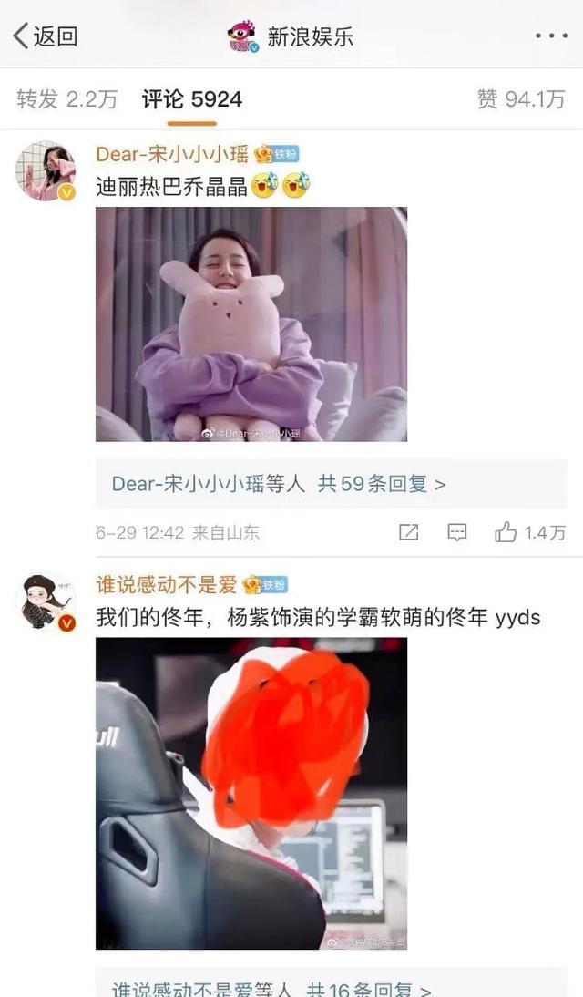 最近,新浪娱乐又发布了一条微博,同时提到了迪丽热巴杨紫,两家的粉丝就纷纷出现控评。