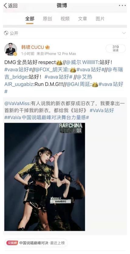 在《中国说唱巅峰对决》舞台现场,VaVa毛衍七毫不避讳外界的舆论压力,她深知歌手要用作品说话的真理:“观众说我的新衣都穿成旧衣了,我要拿出一首新的干掉我的新衣。”在延续一如既往的卓越舞台表现力的同时,VaVa毛衍七如脱胎换骨般成长升级的说唱实力与创作内容态度表达均融入进《站好》表演中,超强的代入感与共振最终让所有人都诚服。VaVa毛衍七勇于挑战、突破自我的信念与能量,在《中国说唱巅峰对决》的舞台完美爆发。致敬D.M.G战队说唱团魂在这个夏天燃烧作为《中国说唱巅峰对决》首发阵容中代表种梦音乐D.M.G的女说唱歌手,VaVa毛衍七显然是如团宠般的存在。新专辑发布就获得GAI周延、艾热AIR、布瑞吉Bridge、FOX胡天渝、威尔Will.T、王以太等说唱圈内好友力赞支持,韩红、郭麒麟、杨九郎、曹鹤阳、烧饼、王九龙、尚九熙、宋雨琦、吴宣仪、安崎、林允等明星也纷纷转发推荐《V解之谜》,足见VaVa毛衍七在圈内外的实力口碑与极佳人缘。这次的《站好》舞台,种梦音乐D.M.G全员第一时间力挺。