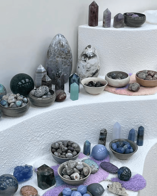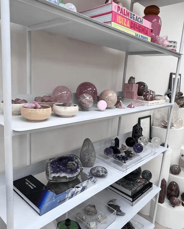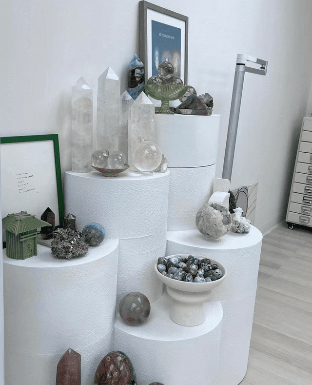 这些水晶按照颜色分类了出来,粉水晶、紫水晶、绿水晶一应俱全,大大小小地摆满了整面墙。