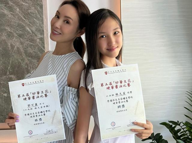 郭可盈原来近日陪女儿参加校内比赛,林天若开心回顾中一生活:今年担任了班长及班会主席,感觉自己又学多了,成长了!记得小学二年级开始加入中国舞蹈团,而中学增设的Dance club( K-pop / Pop dance )令我更肯定自己对舞蹈的热爱 !而本学期的成果是获得“Most Outstanding CharacterAward”及中文写作登上“写意集”与校友们分享;另一件有趣的事~今年我邀请了妈妈参加中文书法比赛,妈妈一口答应,我们更分别获得银奖和铜奖,很有意思啊!