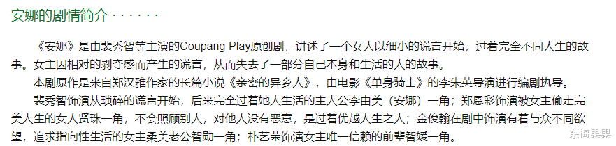 这下才来了兴致去关注剧集呈现的是怎样一个故事。必须得说,本剧在某瓣的剧情简介实在有些不靠谱,也不知是原本就有些颠三倒四还是翻译等等问题,总之一大段话,每个字我都认识,可连起来就是看不懂,云里雾里,到了也没明白韩剧《安娜》的主题究竟是什么,看来唯有自己看了才能一探究竟。