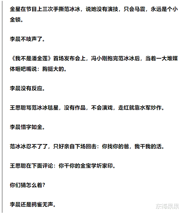 结果李晨呢,被网上总结,范冰冰不管遇到什么事,李晨都没有站过她。