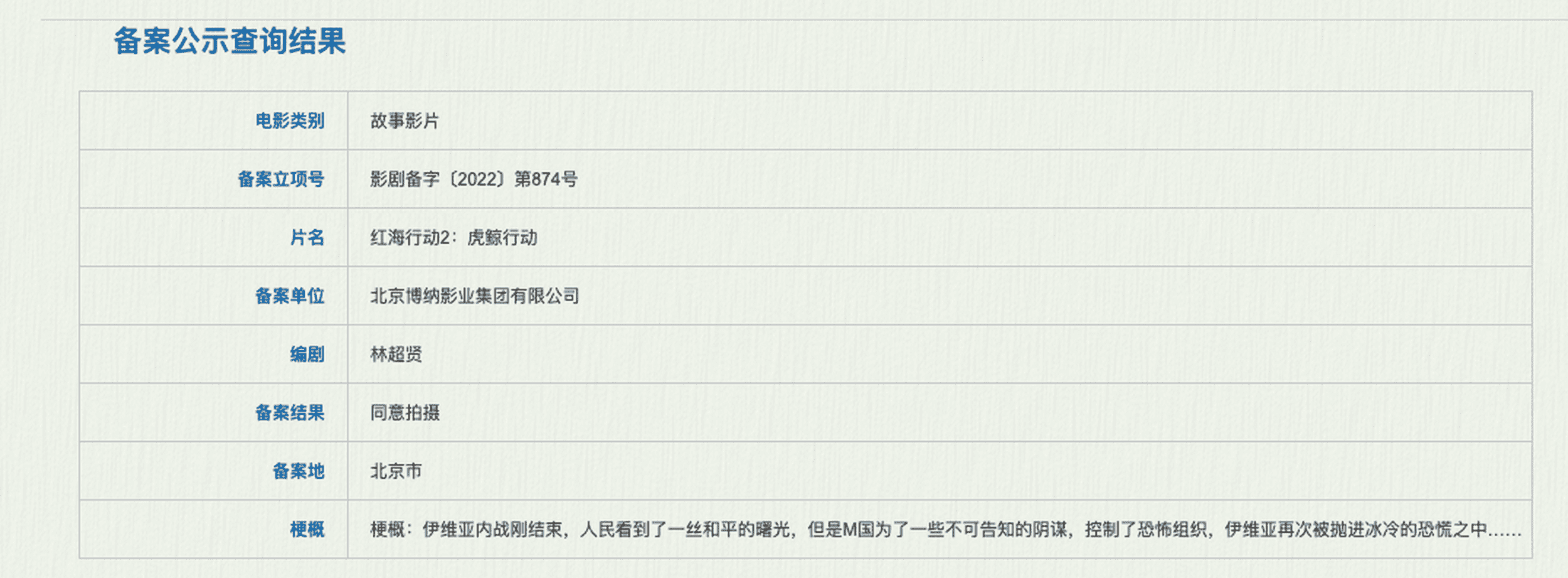 据国家电影局最新备案、立项公示,电影《红海行动2:虎鲸行动》已备案立项,获同意拍摄。备案单位为北京博纳影业集团公司,编剧为林超贤。梗概为:“伊维亚内战刚结束,人民看到了一丝和平的曙光,但是M国为了一些不可告知的阴谋,控制了恐怖组织,伊维亚再次被抛进冰冷的恐慌之中……”