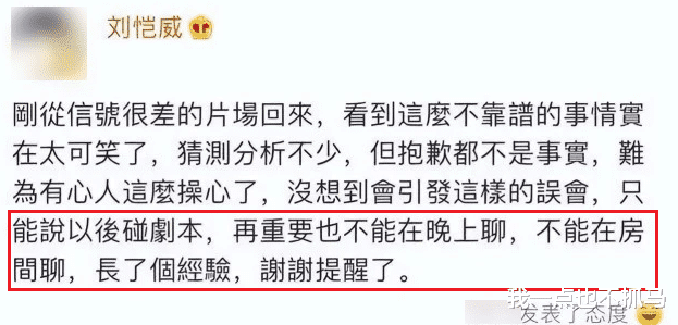 虽然猝不及防,但还是第一时间选择“相信恺威”,可以说杨幂当时给足了对方体面。只不过强颜欢笑、强装镇定的外表下,内心的慌乱还是露了怯。而在杨幂的回应之后,两位当事人才先后发表对此事的解释。刘恺威开玩笑地表示长了个“经验”:“以后碰剧本,再重要的事情也不能在晚上聊,不能在房间聊……”