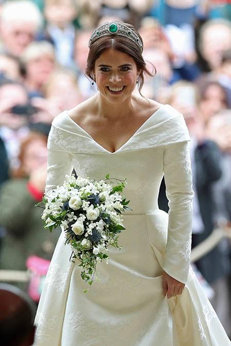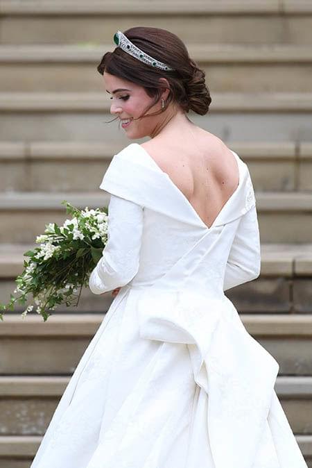 裙子采用巴斯克式V型腰身设计,利用大量的褶皱来修饰身形。Eugenie取下了皇冠,并把头发给放了下来,耳上还戴着早上行礼时的祖母绿耳环。