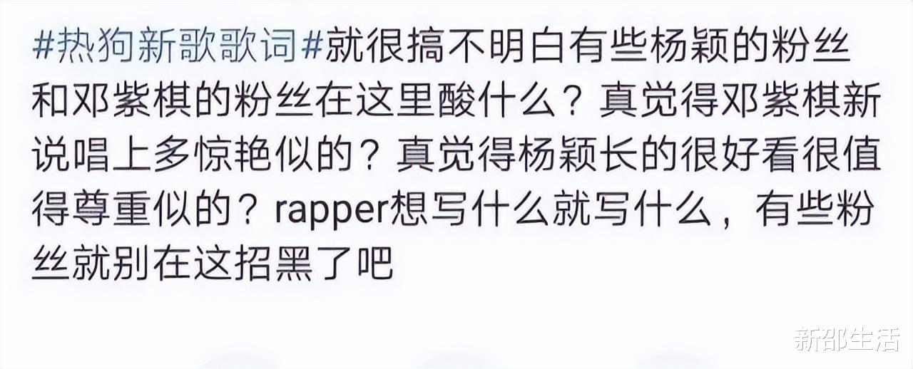 与姜云升不同的是,热狗、杨颖、邓紫棋都是娱乐圈有头有脸的人物,哈圈玩梗虽然司空见惯,但热狗和邓紫棋曾共同在综艺《中国新说唱》中担任导师,公开内涵曾经的工作伙伴,这样真的不会尴尬吗?