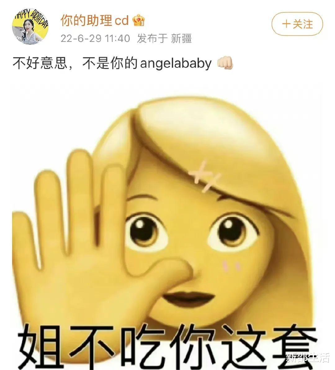 除了网友们的“激情对线”之外,Angelababy的工作人员也发文回应了此事,态度强硬地发文:“不好意思,不是你的Angelababy”。不仅如此,Angelababy的工作人员还配上了一张表情包,上面赫然写着“姐不吃你这套”6个大字。