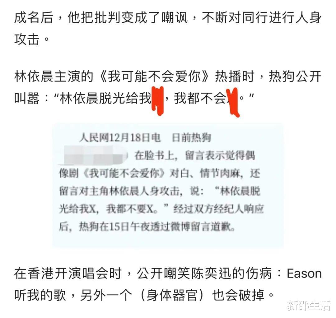其实,热狗身上一直有很大争议,除了歌词风格有些擦边,人设方面也有很大争议。早期上节目的时候,他曾调侃过林志玲、林依晨,在圈内口碑一直很不好。