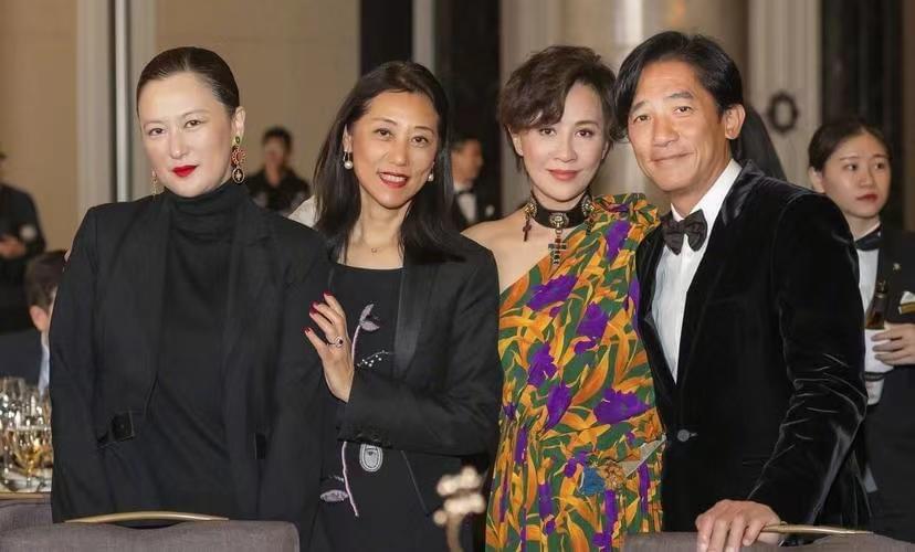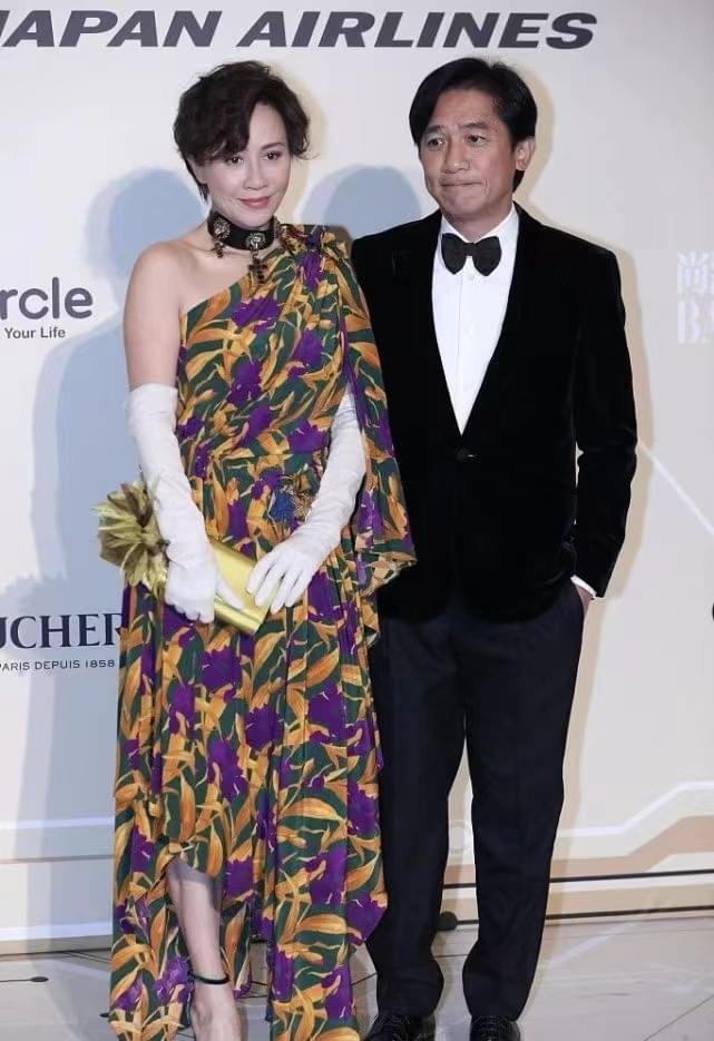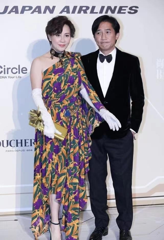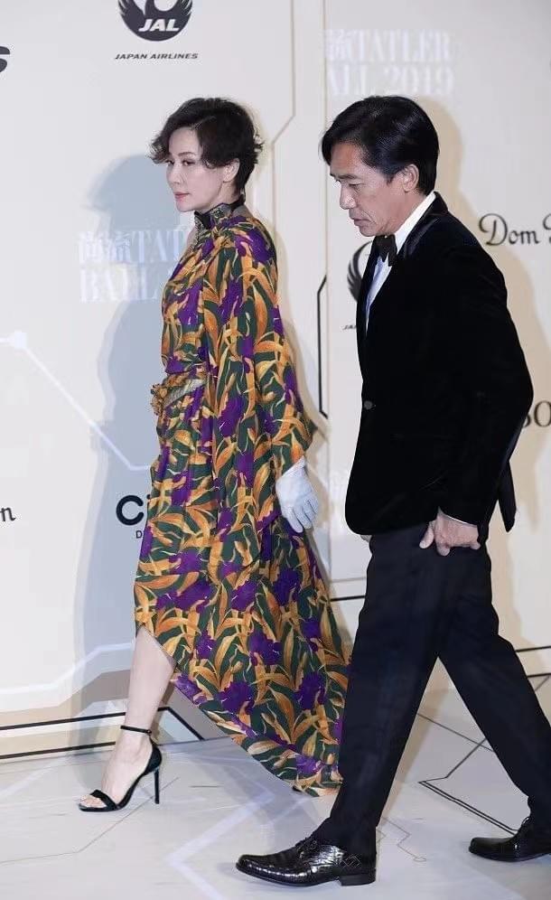 相比之下刘嘉玲的穿搭造型更有看点,从色彩到设计再到饰品修饰,从头到脚显示精致优雅,首先斜肩设计与不规则的裙摆相呼应,增加露肤特点的同时打破长裙的包裹感,让这件长裙穿搭同样利落干练,其次三种色彩的花色拼接能够在人群中脱颖而出,暗黄色,紫色与墨绿色都可以提亮肤色,这种绚烂亮眼的花色裙装展现了刘嘉玲的沉稳贵气,所以两人的合照中女性穿搭更突出。