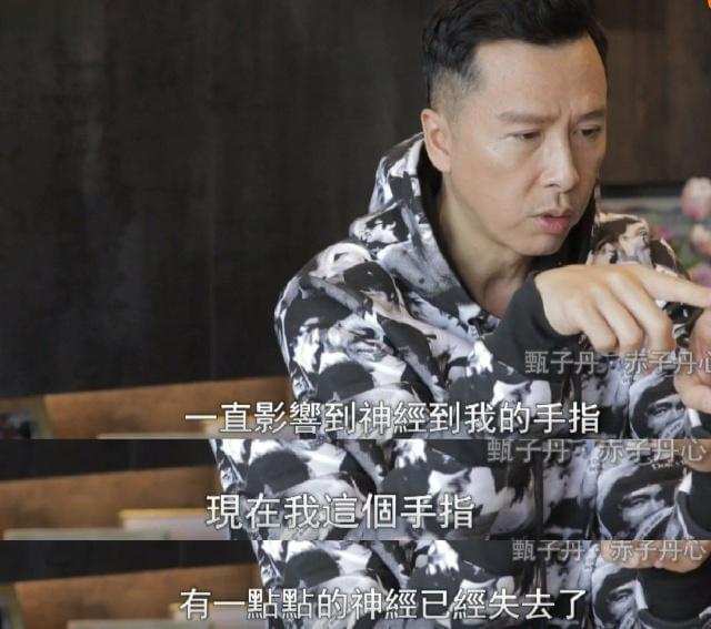 武打明星之所以受到人们敬重,一则因武打观赏性高,二则因他们真拳实打,为作品不惜自己频频深受重伤,这种敬业精神令人钦佩,甄子丹自然也是其中一员大将。在访谈过程中,甄子丹也有谈论到自己的身体状况,他称拍戏37年来,自己受伤无数,而且时常带病上阵,因为拍戏甚至手部差点没了知觉,他一度担心自己武功会废掉,而且也因为拍戏留下了许多后遗症。