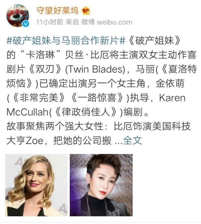 今年第二季度,有一个中美合拍的动作喜剧片《双刃》将要开拍,这是一部双女主影片,其中一个是大家所熟知的喜剧演员马丽,另一个是知名度很高的美国演员贝丝·比厄,单说名字可能大家不知道,但要说她是《破产姐妹》中卡洛琳的饰演者,一定没人不知道吧!