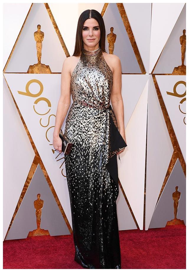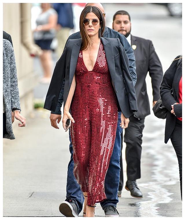 2018年5月,桑德拉·布洛克(SandraBullock)来到洛杉矶参加“吉米·金梅尔现场”(JimmyKimmelLive)脱口秀节目,穿着红色亮片连体裤,戴着圆形太阳镜,看起来很酷。她把一件黑色外套披在肩上。