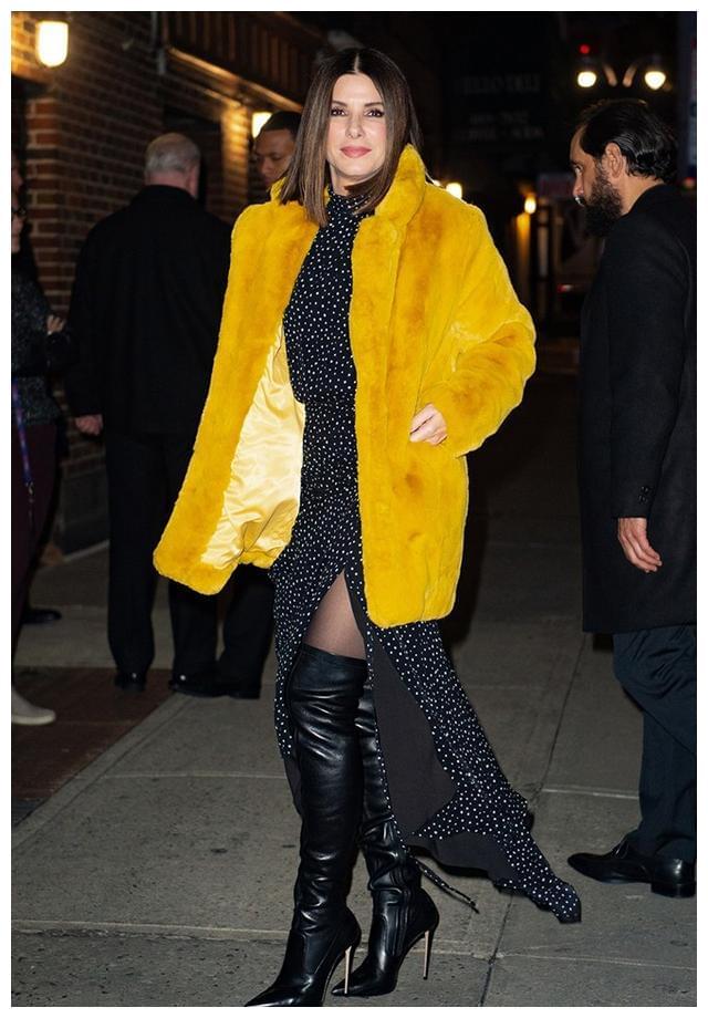 54岁的桑德拉·布洛克(SandraBullock)穿着一件漂亮的黑色连衣裙、性感的皮靴和一件亮黄色夹克,看起来只有她一半的年龄,参加“与斯蒂芬·科尔伯特的深夜秀”