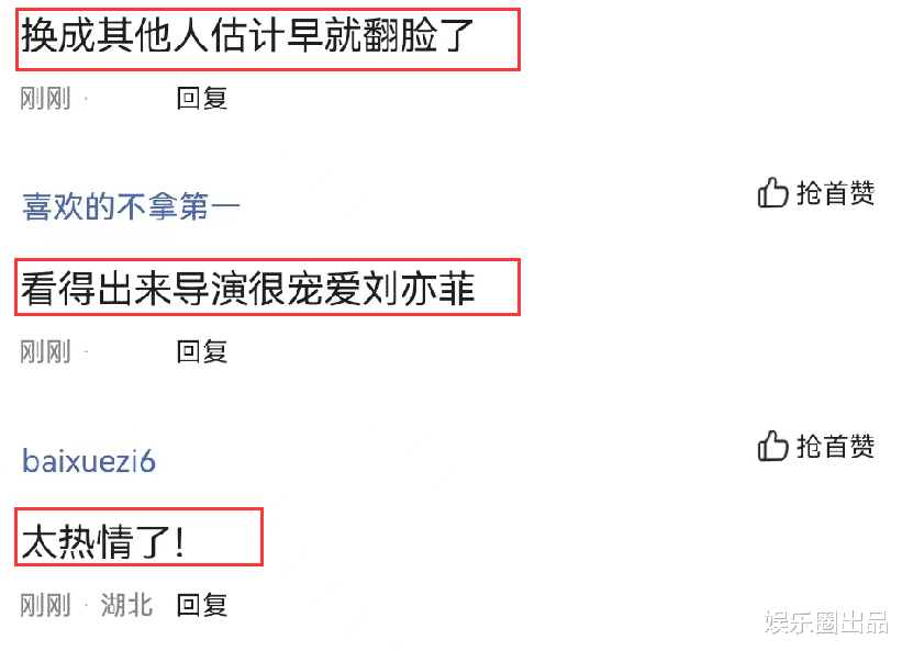 看得出来,大部分网友对刘亦菲衣品和人品的评价还是挺高的,不仅有网友认为刘亦菲的情商很高,而且还有网友认为导演很宠爱刘亦菲,不过,也有一位网友表示“太热情了”。