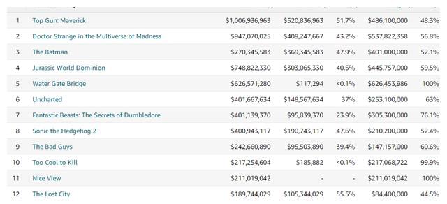 《壮志凌云2》《奇异博士2》分别位列今年全球票房榜第一、第二,属于真正的救市大片。