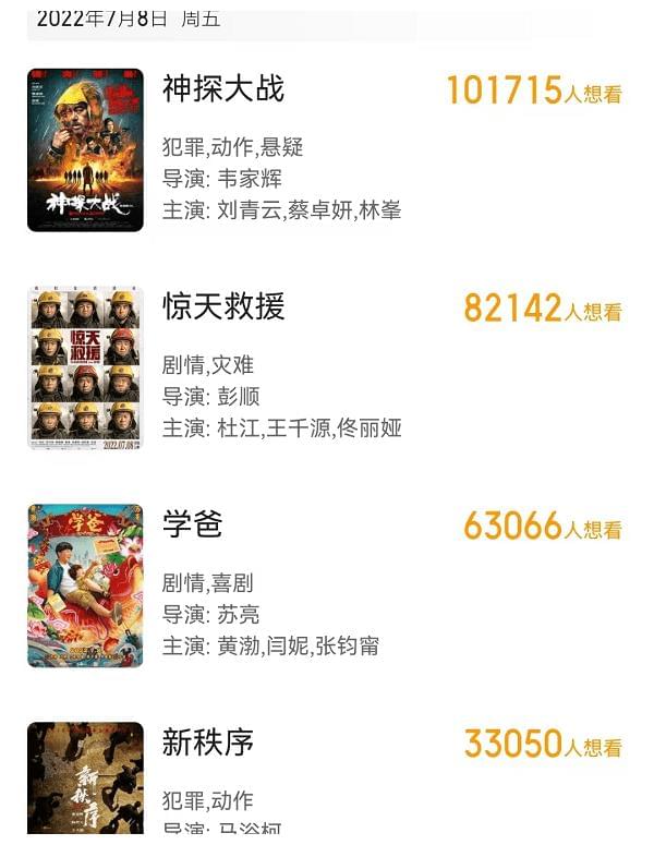 该系列的上部作品《新神榜:哪吒重生》去年春节档上映,卖了4.56亿票房。第二部期待值很高,目前猫眼想看人数5.1万,淘票票想看人数近15万。另外,7月1日起,还有一批高票房老电影会复映,多数都是主旋律,包括《长津湖》《长津湖之水门桥》《流浪地球》《我和我的祖国》《我和我的家乡》《我和我的父辈》《中国机长》《红海行动》《1921》《狙击手》《悬崖之上》《中国医生》《奇迹·笨小孩》《金刚川》《夺冠》《穿过寒冬拥抱你》《守岛人》《一点就到家》《攀登者》《峰爆》。八月已定档的电影还不多,最确定的是8月4日七夕档,目前已经有《遇见你》《我们的样子像极了爱情》《念念相忘》《她的爱情》《我们预见松花湖》几部应景爱情片预定。