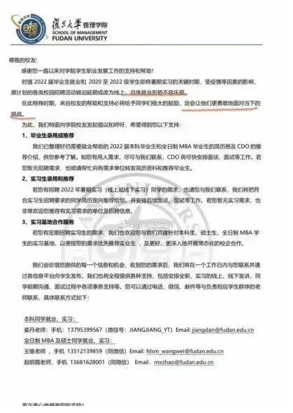 复旦大学管理学院向校友以及社会人士发出求助信,希望能够提供岗位给毕业生。