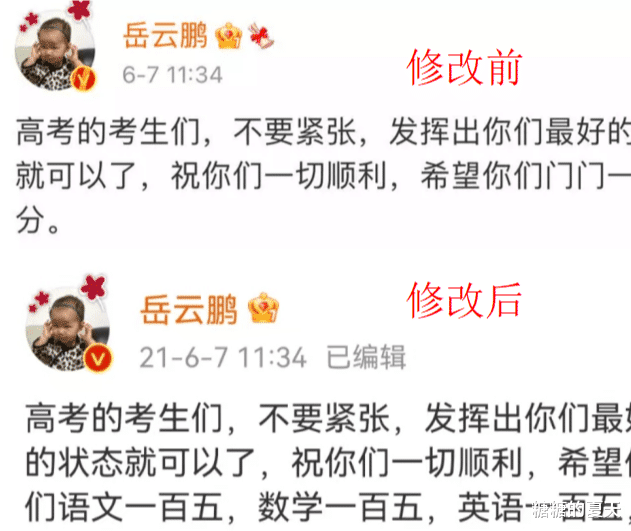 这样高素质的小岳岳却在此前因为一个为高考生送祝福的内容而被吐槽学历低的问题,在高考前夕,为人亲和的岳云鹏就在自己的社交平台上发布了“希望考生门门一百分”的祝愿,此消息一经发出便引发大家的热议,语数英满分一百五,却祝福考一百分,网友还说“真的如您所愿就凉了”,后来岳云鹏也是修改了发布的内容。