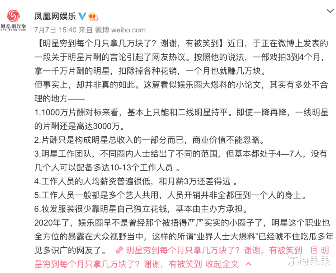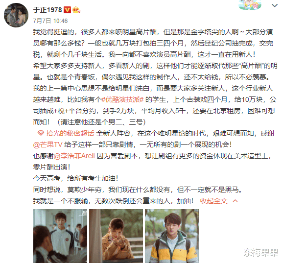 早前于正为演员“高片酬”的说法辩护,发了一篇长文,论证一千万的片酬到明星手里也不剩多少。