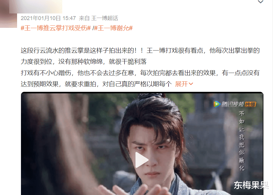 粉丝感叹王一博敬业时的说法是:“打戏时有不小心蹭伤,也不会去过多在意。”