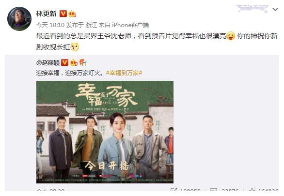 在赵丽颖发布动态后没多久,老搭档林更新转发了对方的动态,并发文为颖宝新剧打call,他写道:“最新看到的总是灵界王爷沈老师,看到预告片觉得幸福也很漂亮”,彩虹屁真是一套一套的啊。不过文末林更新就调皮起来,他自称是颖宝的神:“你的神祝你新剧收视长虹”,又搞笑又暖心。