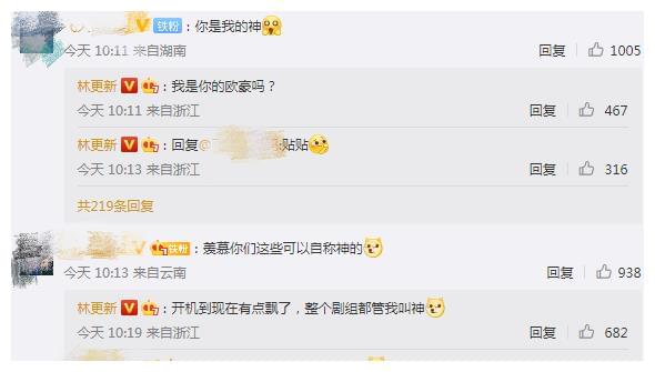 看到林更新的动态后,网友们都乐得不行,有人就留言称“你是我的神”。相信很多网友都清楚这个梗的由来,没想到这次给赵丽颖新剧打call,林更新竟然将此梗玩得666。这不,在网友留言后,他就回复道:“我是你的欧豪吗”,不知道欧豪看到后会不会想打他,哈哈哈。随后,还有人称“羡慕你们这些可以自称神的”,林更新则回复:“开机到现在有点飘了,整个剧组都管我叫神”。