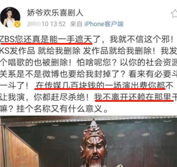渐渐的开始有一句话传出来:娇娇控诉赵本山是因为不能赚钱了;不能赚钱意指两个方面,一方面是在赵家班时不能赚钱,另一方面是离开赵家班后不能赚钱了!