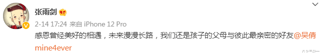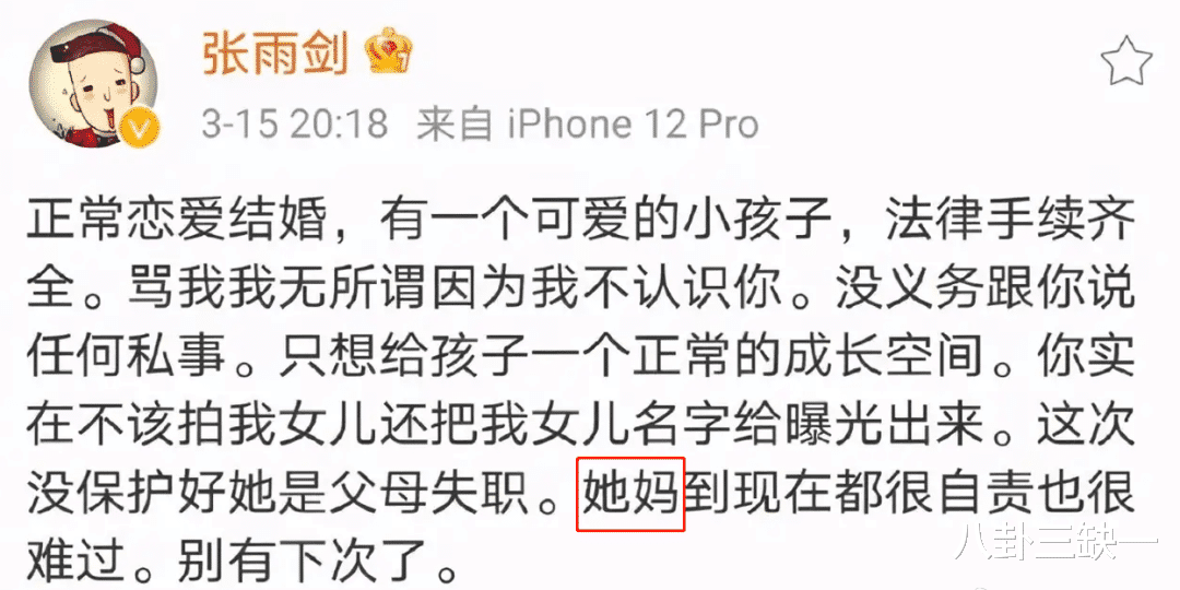 直到去年吴倩带着女儿被拍,他终于装不下去了。张雨剑发微博承认“正常恋爱结婚”,但他全文没有提及“吴倩”的名字,仅用“她妈”来代替。
