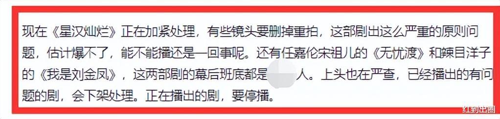 该消息是来自多位业内娱乐博主,包括《星汉灿烂》在内的一系列即将排播的古装剧,都将暂缓播出,进行自审自查,主要方向是剧中的服道化是否有“以倭代华”的嫌疑。