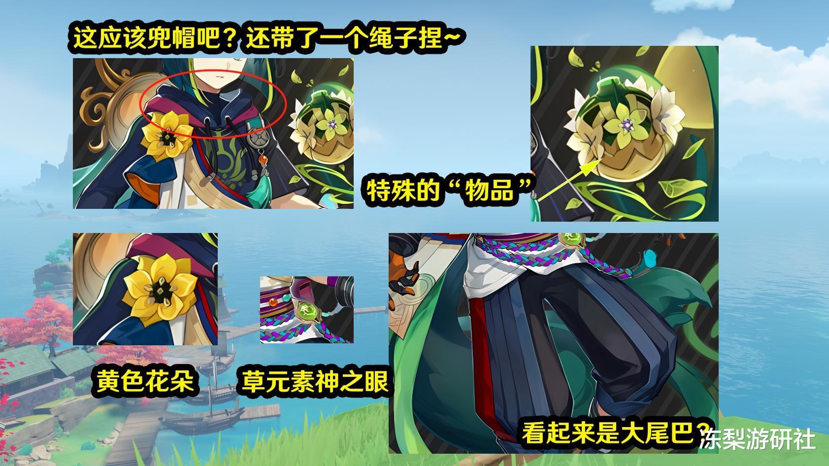 瞳色,上棕下绿,搭配整个发型发色,非常清秀。服饰倒是挺繁杂的,如果我没看错这是穿了一个带兜帽的外罩?同时下面还有一些极具地域色彩的服饰,左侧胸前还别了一枚黄色花朵,右侧则是一个类似花篮的悬浮(应该是爆料者口中那个特殊蓄力射出的物品吧)。