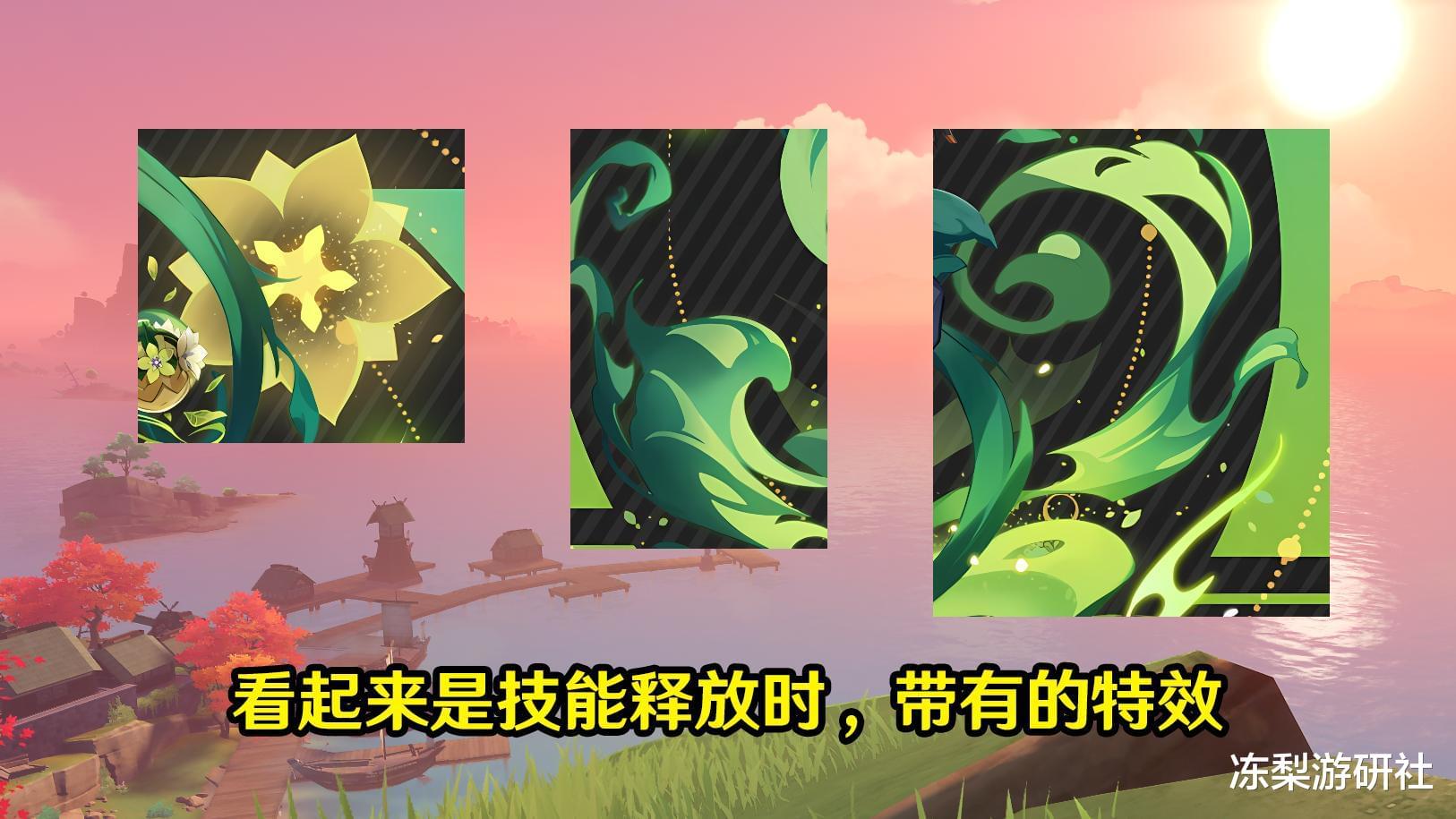 至于立绘背后的一些花纹、图样,大概率是其元素爆发时的一些附带特效,绝大部分原神角色立绘都有这样设计的,特别技能的动作+技能特效。点点草绿星光,带有些许宛若飓风消散的模样,酷得飞起,有种强度的美!