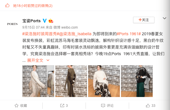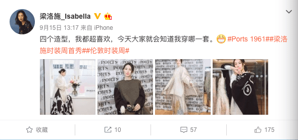然后还和微博粉丝互动,在秀当天下午发出预告,表示「四个造型,我都超喜欢,今天大家就会知道我穿哪一套」,让大家猜她会穿哪一套看秀。