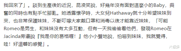 Jacinda的到来让海瑟薇再次当姐姐,也让罗密欧终于当上了哥哥。谈及三个孩子日常,昆凌透露称在怀孕时,海瑟薇就十分期待妹妹的到来,也非常懂得保护妹妹,不断叮咛大家戴口罩和消毒以后才能靠近妹妹。不得不说,咱们海瑟薇姐姐真的是好贴心啊。