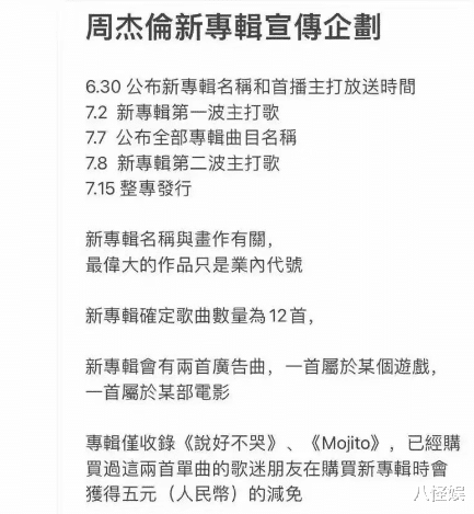家庭幸福美满的周杰伦,在事业上也迎来好消息即将发布新专辑,据悉,新专辑将于7月15日上线,目前,网上还曝光了周杰伦新专辑时间表,而上面写道6月30日也就是今天将公布新专辑名单和主打歌放送时间,不过,截止到现在并没有任何消息,虽然已经迫不及待地想要听到周董的新专辑,但大家还是要以官方消息为主,安静等官宣吧!