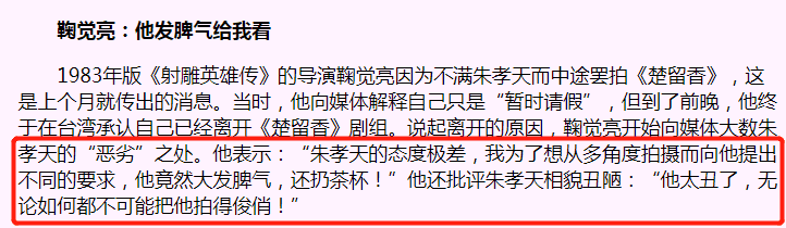 但与朱孝天口中的“喜欢”相悖的是,在拍摄《楚留香传奇》期间,朱孝天却因为“脾气大难搞”,与导演鞠觉亮产生巨大冲突摩擦。