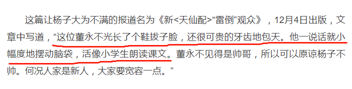 还有一位记者更是将“麻辣点评”进行到底,在报道上直言不讳:“这位董永‘鞋拔子’脸,地包天,一说话就摆动脑袋,活像小学生读课文。”