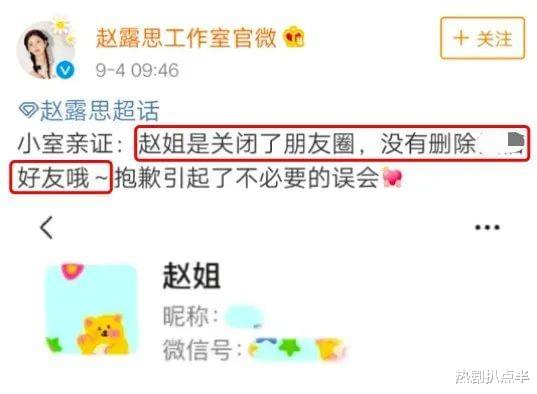 后来,赵露思工作室官微火速回应,称赵露思只是关了朋友圈,并没有删过人,意思就是误会一场。