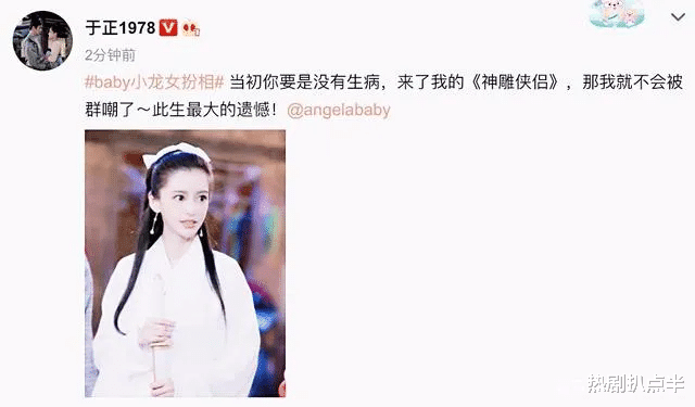 有意思的是,几年后angelbaby在节目中扮了小龙女,于正又跑来发文说,“当初你要是没有生病,来了我的《神雕侠侣》,那我就不会被群嘲了,此生最大遗憾。”