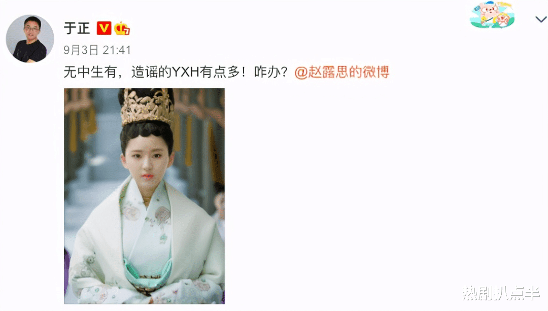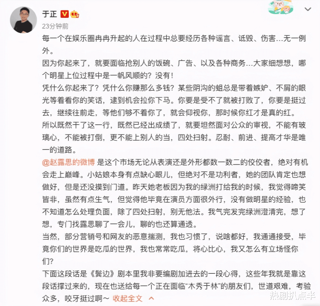 于是,赵露思的团队就联系了于正,颇有兴师问罪的意思。但于正可不是省事儿的主儿,又再次发文还@了事件主角赵露思,来了一波“明褒暗贬”。