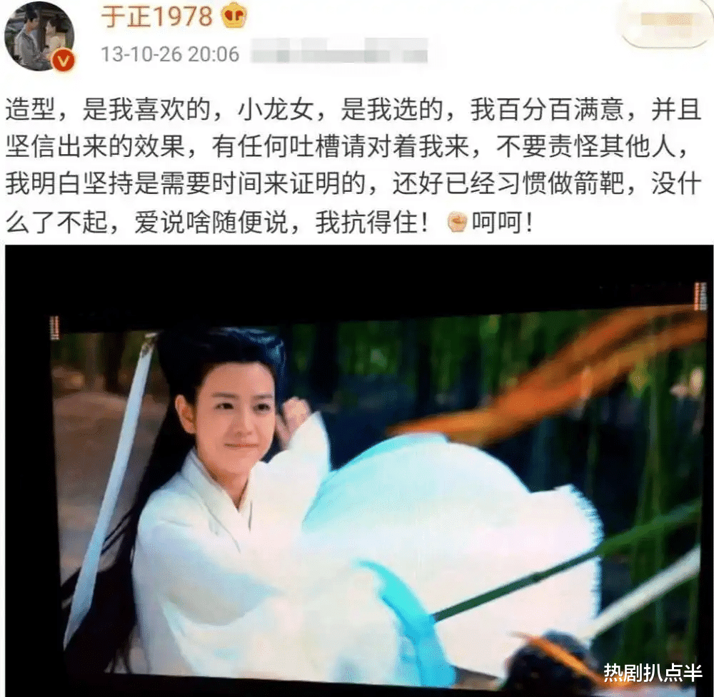 哪曾想播出后,陈妍希因古装造型却群嘲,于正又出来发文说,小龙女是他自己选的,百分百满意,还让大家随便说,他扛得住。