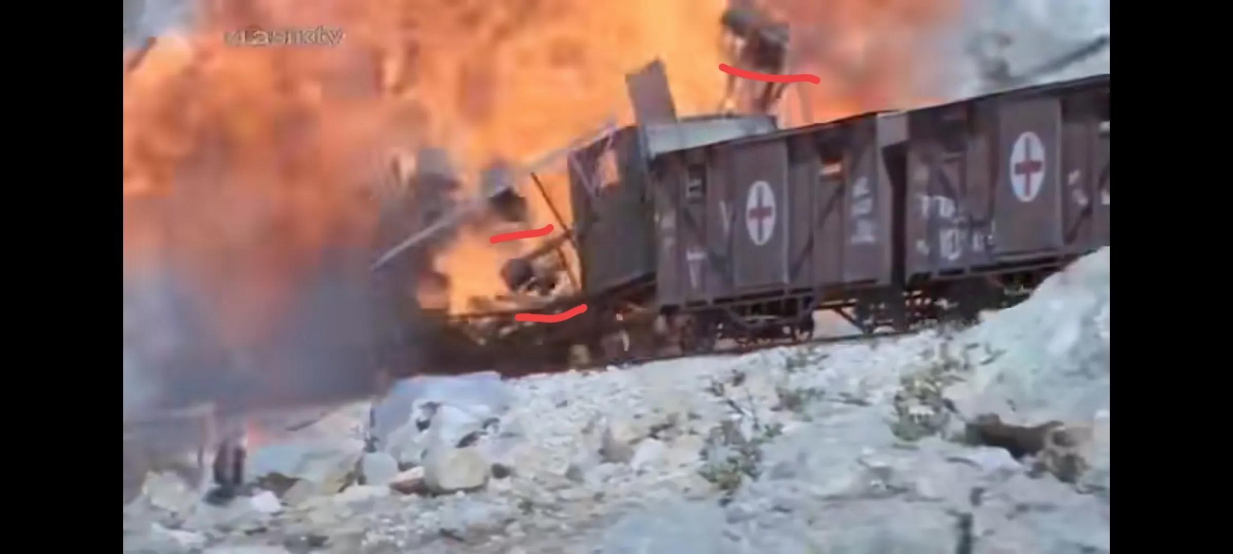 3、比肖夫押运油料列车被车头撞时,毕肖夫消失了(也许当时拍摄手段没现在的技术,都是用小模型来拍摄)。还有从之前的片段可以看出毕肖夫乘坐的第一节车厢里没有装油,但被撞爆炸的瞬间飞出了油桶。