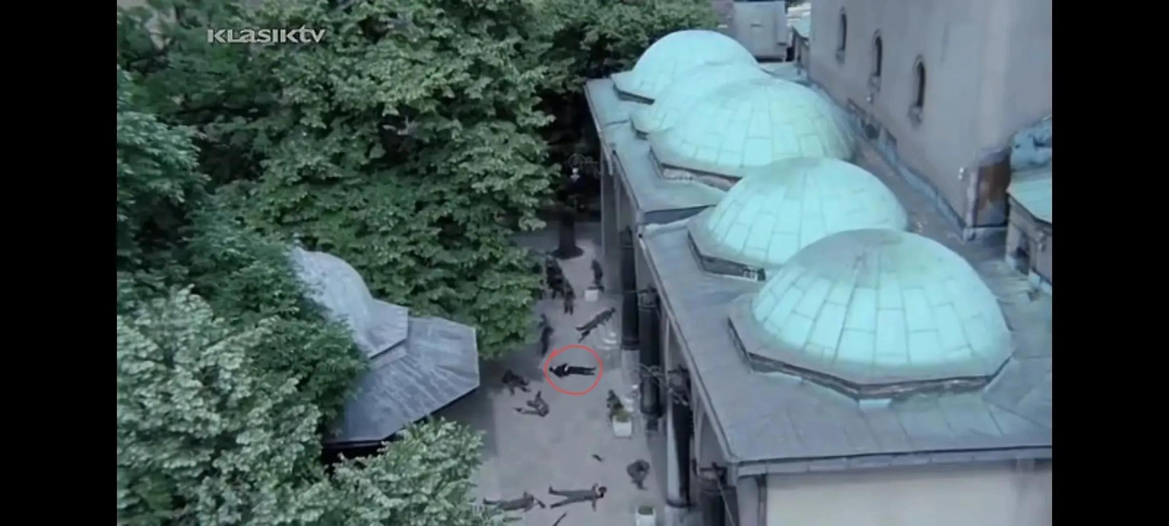 2、在一个场景里有两处漏洞,一是谢德赴清真寺开枪击毙了冒充的联络员,当谢德转身被钟楼上的机枪打死倒地后,假联络员的尸体消失了(按场景交待,假联络员、谢德、钟楼应该处于同一视野范围)。二是谢德被打死倒地后有一个镜头交待了谢德倒地的位置,但当比肖夫指挥德军进攻钟楼时,从瓦尔特视觉范围看谢德与之前倒地位置有变化,在第一和第二台阶的中间,并且顺时针转了近50度。