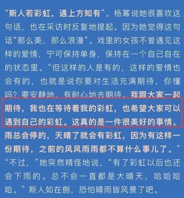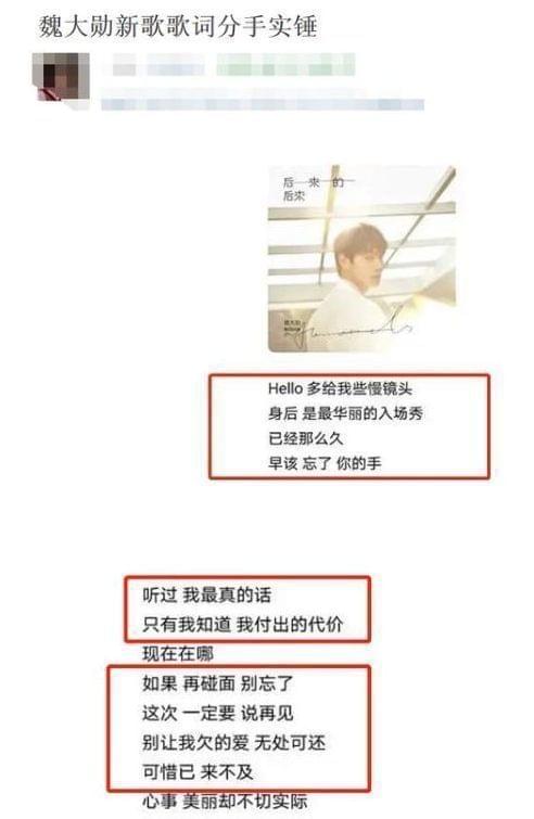 直到去年,有网友爆料,魏大勋和杨幂分手了,男方发布的新歌歌词似乎证实了这一点。而杨幂在接受采访时透露,她正在迎接属于自己的彩虹,证明已经恢复了单身。