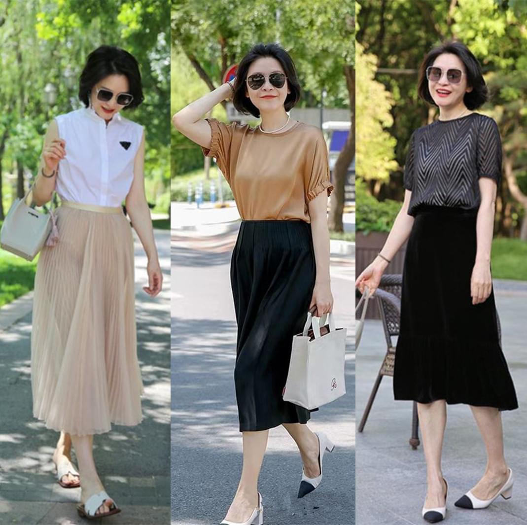 能钻进中年女性心坎里的高品相半身裙,对身材的包容度真的超高!到膝盖下方的长度, 恰恰好露出纤细小腿,就能给人一种“本来就很瘦”的错觉。搭配夏日舒适小衫,形成了气质和减龄毫无违和感的碰撞,再结合气场很足的高跟鞋,高阶韵味就来了。